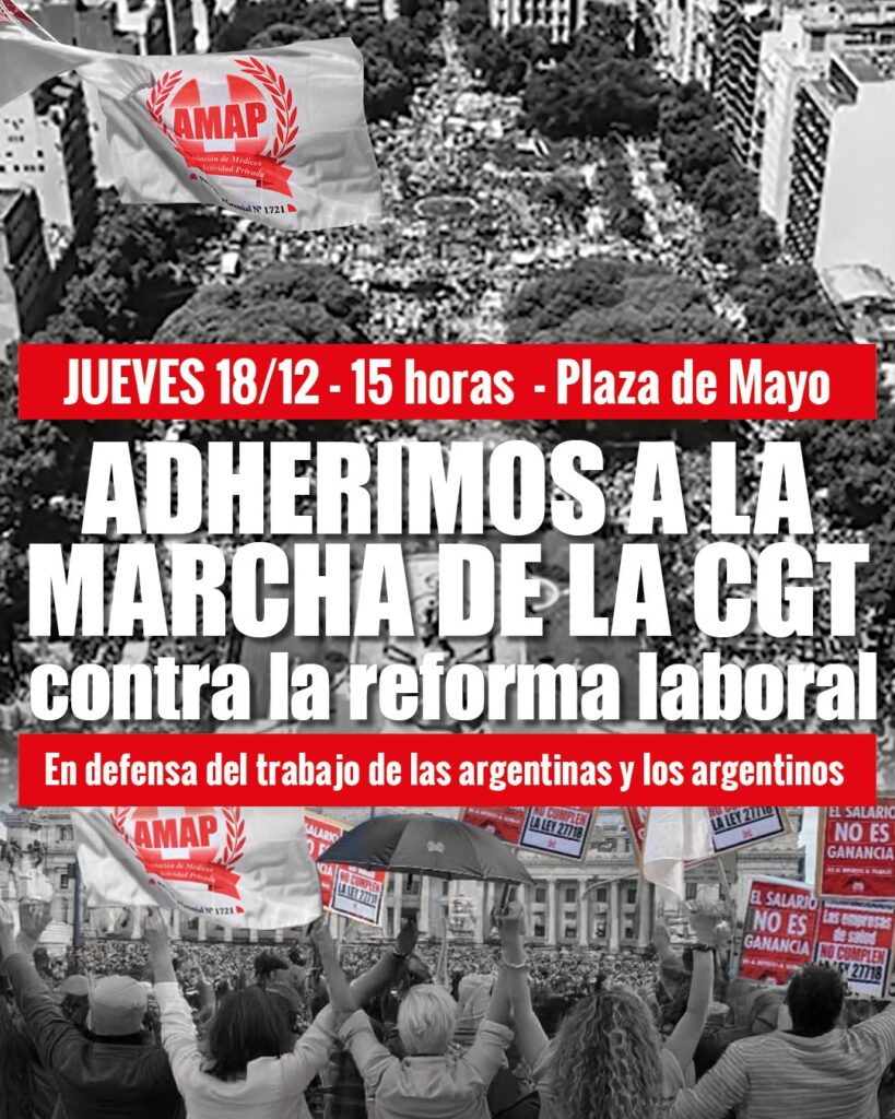 La Asociación de Médicos de la Actividad Privada (AMAP) adhiere y acompaña la movilización convocada para el próximo 18 de diciembre, a realizarse a las 15.00 hs en Plaza de Mayo, en rechazo a la reforma laboral impulsada por el gobierno nacional.