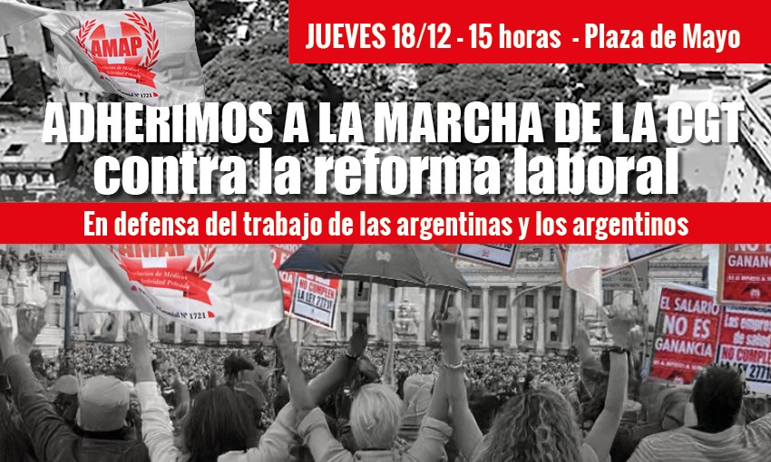 La Asociación de Médicos de la Actividad Privada (AMAP) adhiere y acompaña la movilización convocada para el próximo 18 de diciembre, a realizarse a las 15.00 hs en Plaza de Mayo, en rechazo a la reforma laboral impulsada por el gobierno nacional.