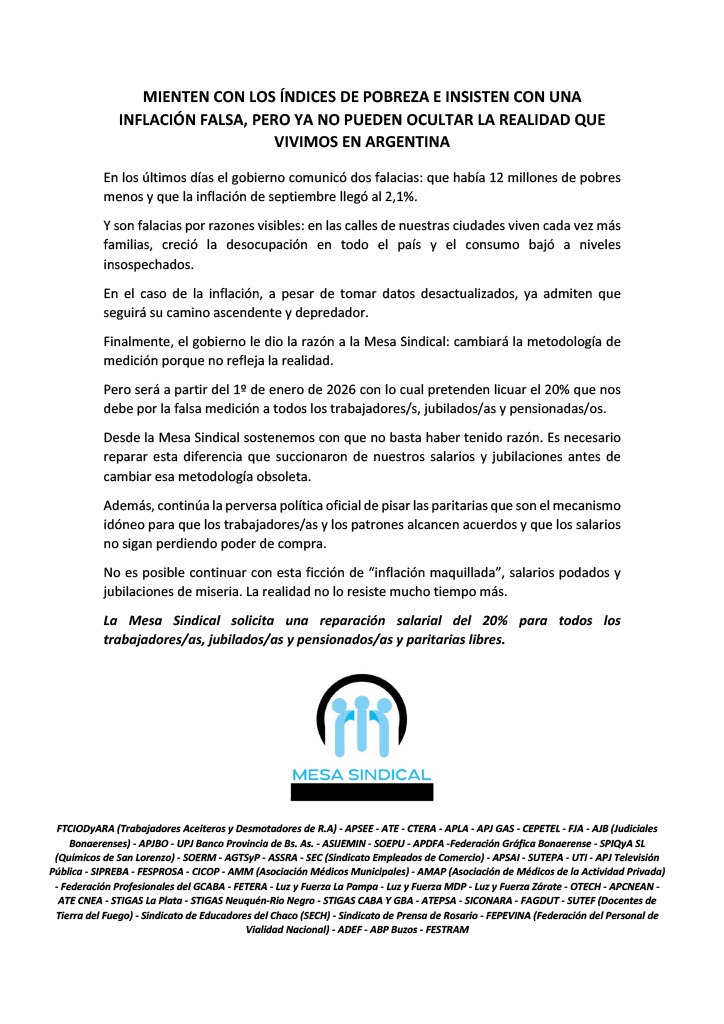 Ante esta situación, la Mesa Sindical exige una reparación salarial urgente del 20% y la libertad plena de las paritarias, como pasos indispensables para recomponer el ingreso de los trabajadores y defender su dignidad frente al ajuste.
