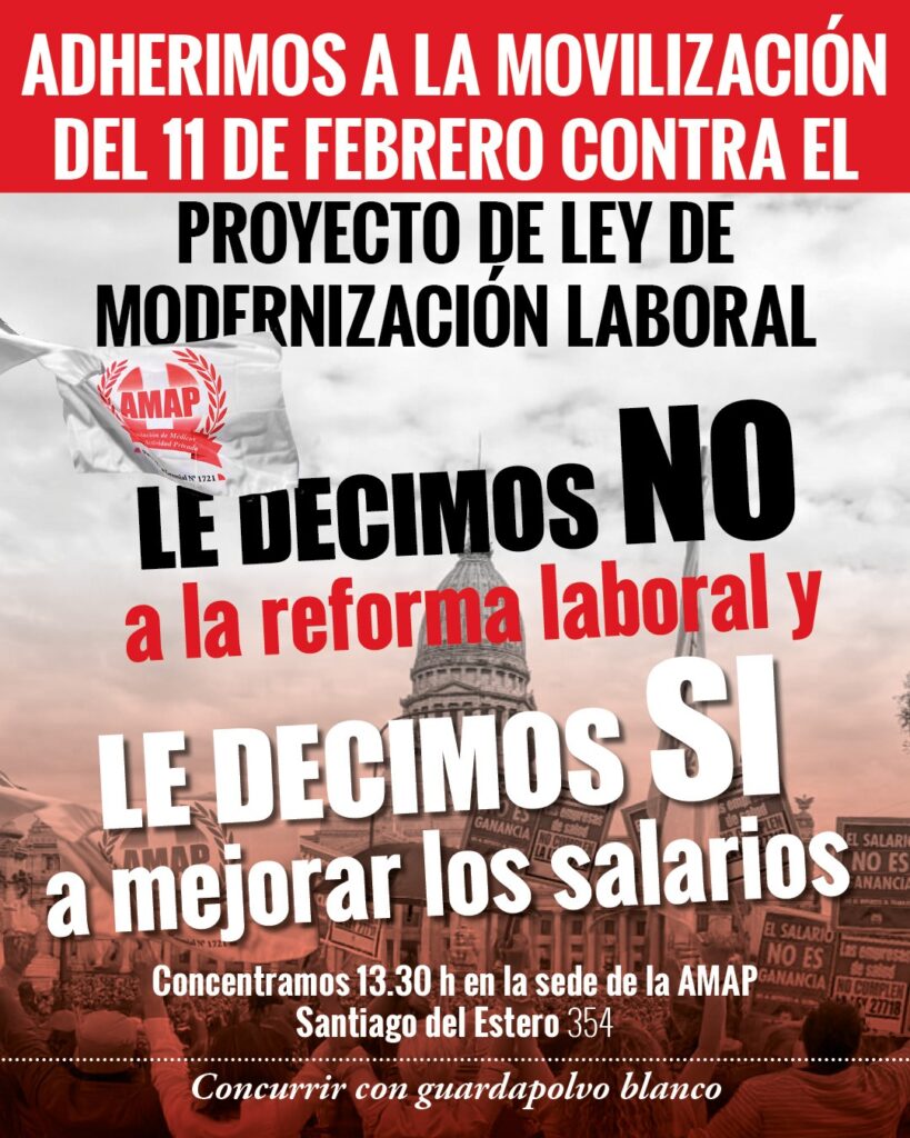 La AMAP adhiere y convoca a la movilización del miércoles 11 de febrero en rechazo a la reforma laboral impulsada por el Gobierno nacional. La concentración será a las 13.30 h en nuestra sede de Santiago del Estero 354. Se convoca a concurrir con guardapolvo blanco.
