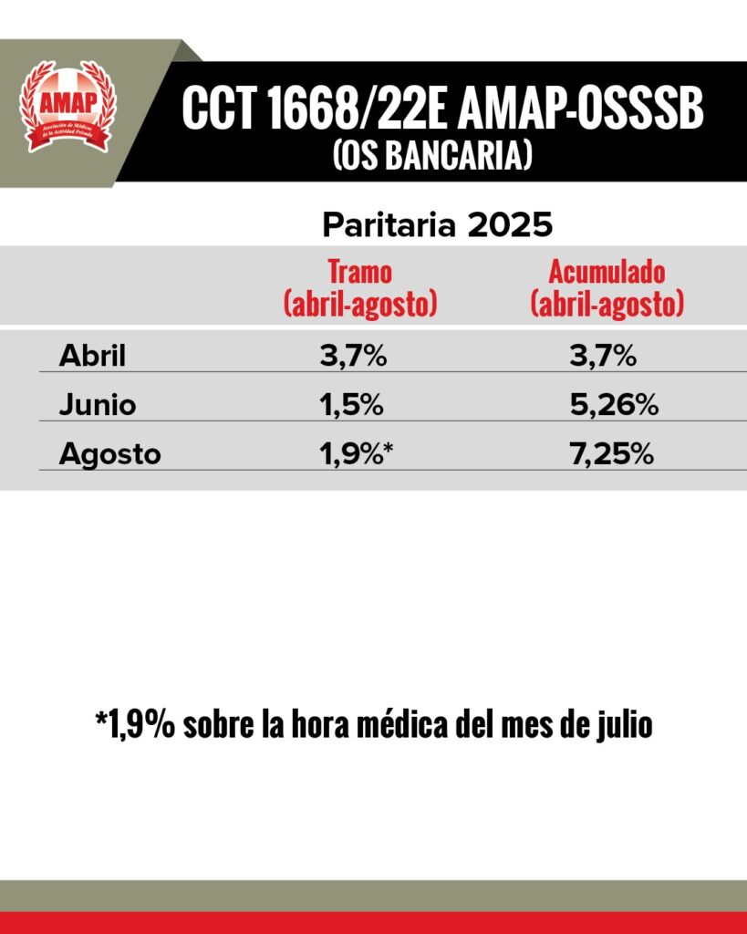 En el marco de la negociación paritaria contínua del perído 1 de abril 2025 al 31 de marzo 2026, entre la AMAP y OSSSB (Obra Social Servicios Sociales Bancarios), se consensuo un incremento salarial del 1,9% sobre la hora médica en carácter acumulativo vigente al mes de julio, a abonarse con el salario del mes de agosto.