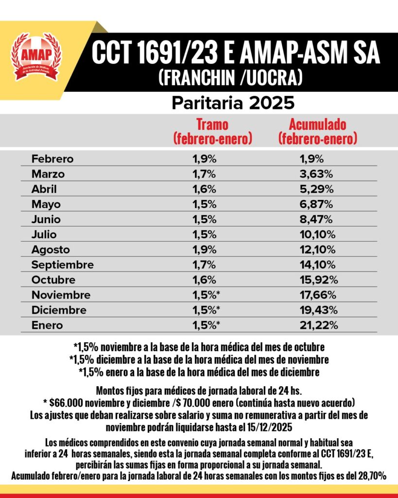 En el marco del reajuste paritario pactado para el mes de noviembre entre la AMAP y la Administradora Sanatorial Metropolitana S.A(sanatorio Franchin/UOCRA), se establecieron incrementos salariales acumulativos del 1,5% mes de noviembre sobre la base de la hora médica de octubre, 1,5% mes de diciembre sobre la base de la hora médica de noviembre y 1,5% mes de enero de 2026 sobre la base de la hora médica de diciembre de 2025.