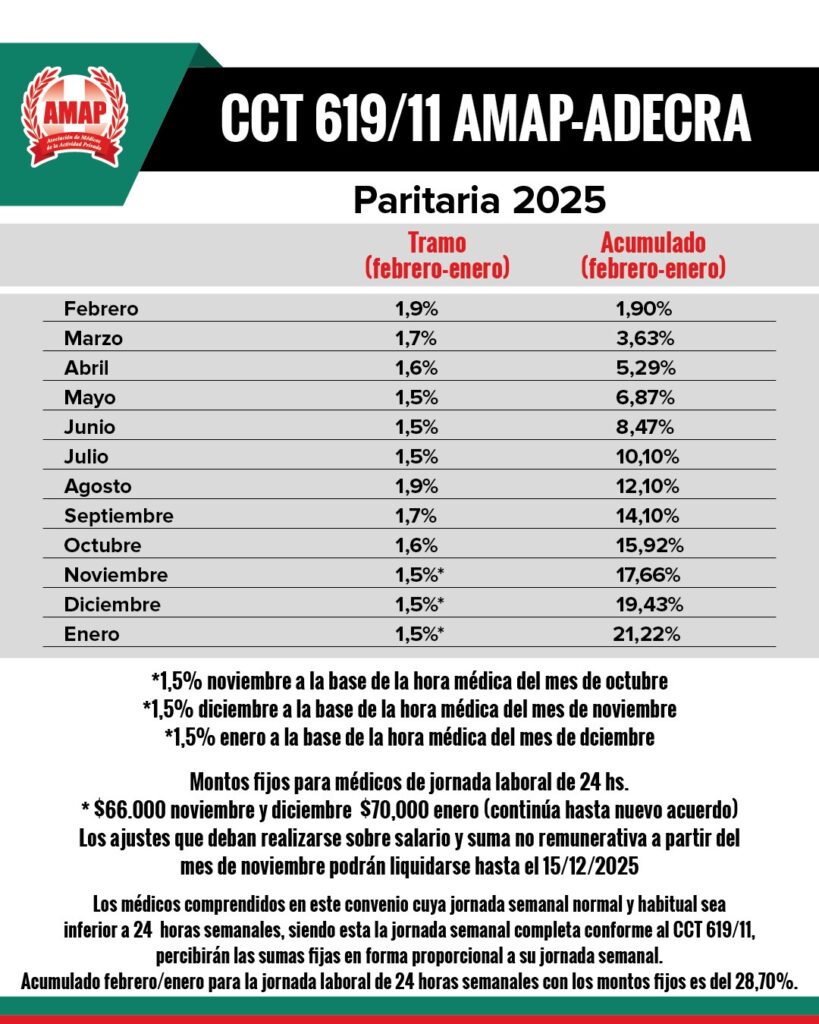 En el marco del reajuste paritario pactado para el mes de noviembre entre la AMAP y la Asociación de Clínica, Sanatorio y Hospitales Privados de la República Argentina (ADECRA), se establecieron incrementos salariales acumulativos del 1,5% mes de noviembre sobre la base de la hora médica de octubre, 1,5% mes de diciembre sobre la base de la hora médica de noviembre y 1,5% mes de enero de 2026 sobre la base de la hora médica de diciembre de 2025.