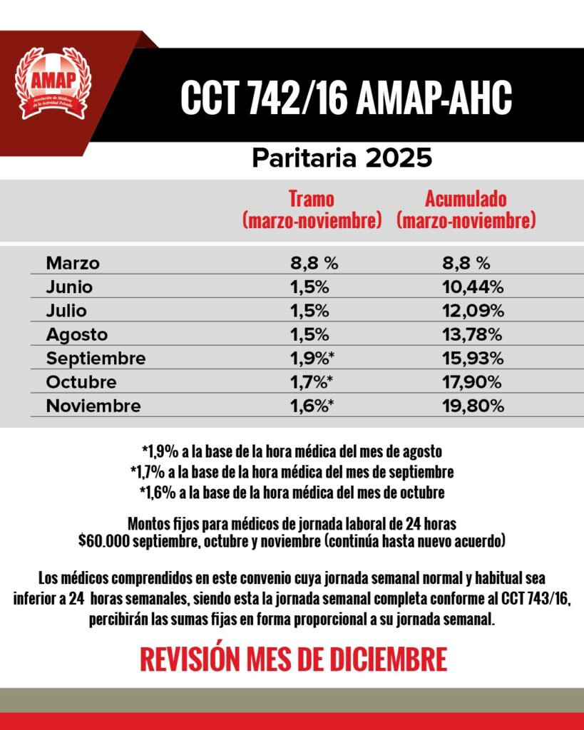 En el marco del reajuste paritario pactado para el mes de octubre entre la AMAP y la Asociación de Hospitales de Colectividades y Particulares sin Fines de Lucro, se establecieron incrementos salariales acumulativos del 1,9% mes de agosto sobre la base de la hora médica de julio, 1,7% mes de septiembre sobre la base de la hora médica de agosto y 1,6% mes de octubre sobre la base de la hora médica de septiembre.